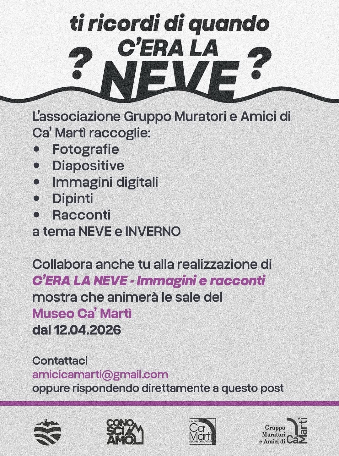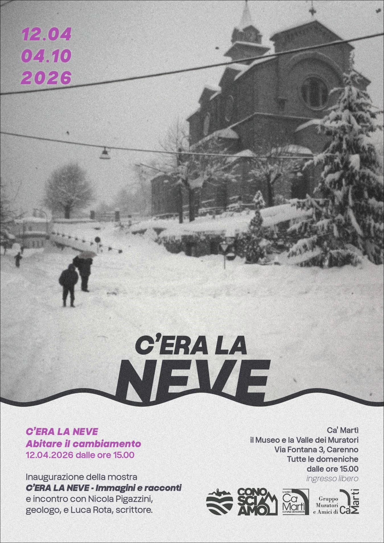 Domenica 12/04 dalle ore 15.00 sarò a Carenno (Lecco) per parlare dei «bei tempi» in cui “C’era la neve”, cioè di quando sulle nostre montagne si poteva sciare ovunque e il turismo ha trasformato la vita dei montanari del tempo, e di come oggi si possa “Abitare il cambiamento” indotto dalla crisi climatica, che rende lo sci sempre più insostenibile, e dalle nuove sensibilità diffuse tra chi frequenta le montagne che puntano a una fruizione turistica più dolce e consapevole. Dialogherò con Nicola Pigazzini, geologo e grande conoscitore delle montagne, in un incontro organizzato da Ca’ Martì – Il Museo e la Valle dei Muratori nell’ambito della campagna “ConoSCIamo” e dei Giochi della Cultura 2026.
