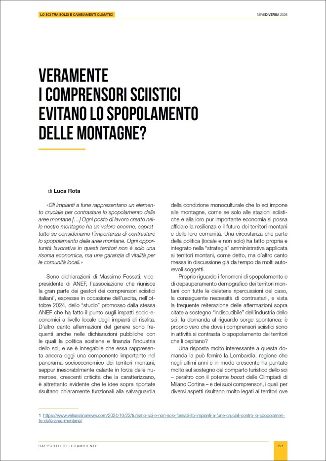 Di sicuro non alle comunità, eccetto che per quei pochi soggetti interni alla filiera turistica alla quale tuttavia spesso vi risultato totalmente dipendenti, ostaggi, prigionieri. Tale verità è ben dimostrata dai dati demografici dei comuni che ospitano i comprensori sciistici i quali, salvo rarissimi casi, stanno costantemente perdendo abitanti e hanno gli indicatori strutturali (età media della popolazione, indici di ricambio della popolazione attiva, rapporto tra chi lavora e chi no, tasso di natalità, eccetera) in continuo peggioramento. Di questa realtà, con un focus sui comprensori sciistici della Lombardia, ne ho scritto su “Nevediversa 2026”: cliccate sull’immagine qui sopra, il mio articolo lo trovate da pagina 271.