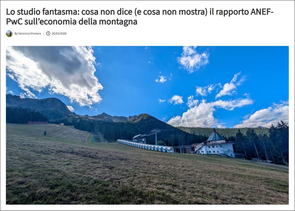 Al dossier “Nevediversa 2026”, curato da Legambiente, che da anni monitora con rigore scientifico, un’ampia messe di dati oggettivi e conseguenti analisi approfondite la realtà della montagna invernale italiana – dossier liberamente consultabile e scaricabile qui al quale ho avuto il privilegio di contribuire – ha risposto dopo pochi giorni l’ANEF, Associazione Nazionale Esercenti Funiviari – gli impiantisti che gestiscono l’industria dello sci in Italia, in pratica – con uno studio commissionato a PwC Italia non pubblico e non diffondibile (!) dal titolo “L’economia della Montagna. Impatti e sfide del sistema montagna in Italia”, con il quale si dimostrerebbe il valore aggiunto e la grande ricchezza che lo sci sarebbe in grado di generare e dunque in questo modo mirando a contraddire, indirettamente ma non troppo, i dati e le analisi di “Nevediversa”.