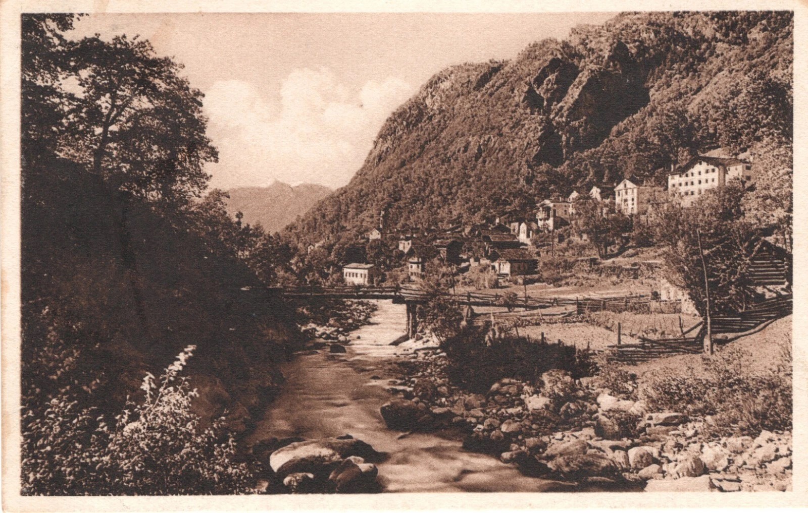[Castasegna ad inizio Novecento. Immagine tratta da qui.]Posto ciò, a una zona alpina così peculiare sono stati dedicati molti libri, soprattutto in lingua tedesca, ma tra i più belli in assoluto, assolutamente attinente al tema del «transito», è senza dubbio La Bregaglia. Escursioni nel paesaggio e nella sua storia di Silvia Andrea (Edizioni Casagrande, 2016, pagg.176; orig. Das Bergell, Wanderungen in der Landschaft und ihrer Geschichte, 1920). Silvia Andrea è lo pseudonimo di Johanna Garbald-Gredig, nata e cresciuta a Zuoz, in Engadina, nel 1840, un secolo fa considerata una delle principali autrici letterarie svizzere e poi quasi dimenticata, che ha legato la seconda parte della sua vita alla Val Bregaglia nella quale morì nel 1935, a Castasegna, il villaggio nel cui mezzo c’è il confine con l’Italia (per la cronaca la prima parte della valle è in territorio italiano) e dove oggi ha sede una prestigiosa e assai attiva Fondazione culturale a lei intitolata.