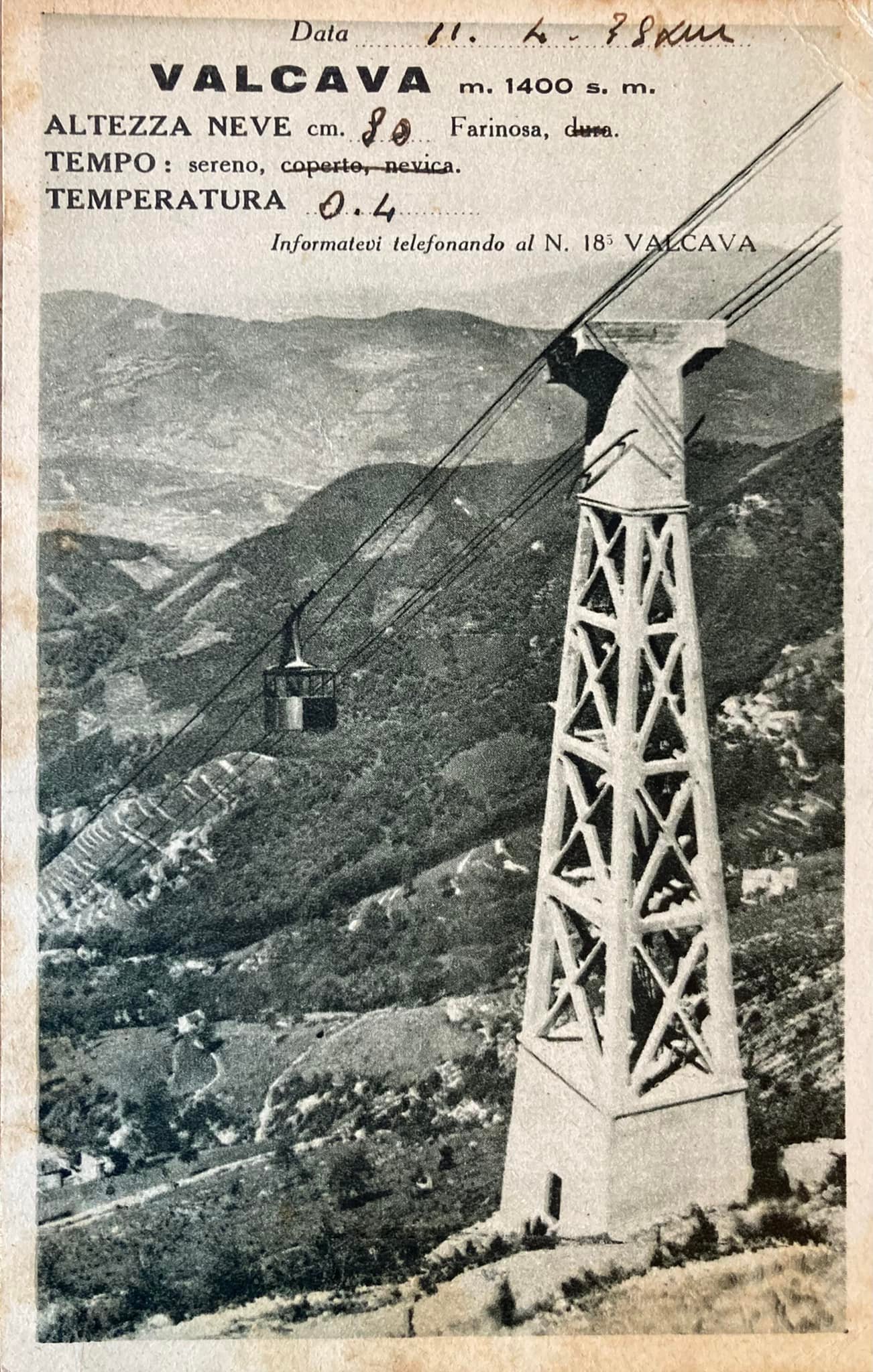 Quella che vedete nell’immagine è la copia di una suggestiva locandina della Funivia di Valcava, aperta nel 1928, la prima costruita in Lombardia e seconda in tutta Italia, un vero e proprio gioiello ingegneristico dell’epoca le cui cabine, dal centro di Torre de’ Busi, raggiungevano i 1240 metri della località sull’Albenza con un percorso della durata di undici minuti lungo 2680 metri e un dislivello di 800 metri. Grazie alla funivia, e alla sua vicinanza con Milano (l’Albenza è il rilievo montuoso di oltre 1400 metri di quota più vicino in assoluto al centro del capoluogo lombardo), Valcava divenne una delle prima stazioni sciistiche delle Alpi centrali e una località di villeggiatura rinomata e frequentata tutto l’anno, come indicava la locandina nelle «Caratteristiche del luogo»: in primavera per la celeberrima fioritura dei narcisi, che attirava gitanti da tutta la Lombardia (e attira ancora oggi, anche se non come allora), in estate per la frescura alpestre e la possibilità di effettuare numerose facili escursioni, in autunno per il transito degli uccelli le cui rotte migratorie alpine attiravano cacciatori in quantità (e meno male che oggi non è più così!) e infine in inverno per la pratica dello sci sia alpino che nordico, dato che Valcava ospitava pure un piccolo trampolino per il salto – attività allora assai diffusa anche sulle montagne italiane, oggi invece relegata a pochissimi praticanti anche per l’assenza di impianti. D’altro canto allora le nevicate a Valcava, nonostante la quota modesta, risultavano abbondanti e durature grazie a temperature inferiori rispetto a quelle odierne e malgrado l’esposizione a ovest, come dimostra l’immagine sottostante: un’altezza neve di 80 centimetri e una temperatura di 0.4°C misurate l’11 di aprile sono dati che da lustri nemmeno in pieno inverno si possono registrare!