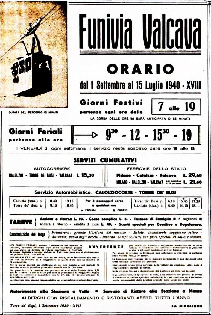 Ma c’è un’altra storia peculiare che la locandina lì sopra racconta: lo fa in modo indiretto ma non per questo meno importante, in senso generale e per le sorti di Valcava. La locandina è infatti datata 1 settembre 1939 e presenta gli orari fino al 15 luglio del 1940: è dunque l’ultima che venne diffusa prima dell’entrata in guerra dell’Italia, proclamata il 10 giugno di quell’anno. Il secondo conflitto mondiale si fece sentire in modo drammatico a Valcava, che divenne sede di postazioni di avvistamento contraereo e poi luogo di scontri anche cruenti tra truppe fasciste e milizie partigiane; ma il conflitto determinò conseguenze anche per l’attività della funivia, che da poco dopo la fine della guerra vide andare in calando l’appeal turistico per la crescente concorrenza di altre località e al contempo cominciò a manifestare il progressivo deterioramento degli impianti, delle funi e, di conseguenza, l’aumento dei costi di manutenzione al fine di garantirne l’efficienza e la sicurezza.