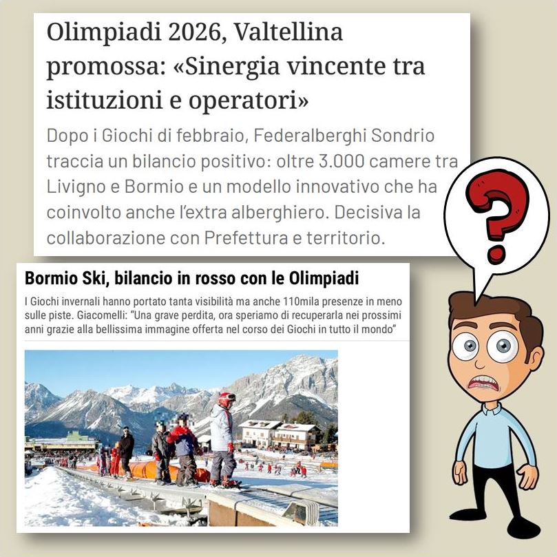 [Un altro esempio di propaganda post-olimpica retorica e autocelebrativa istituzionalmente indotta ma in realtà costruita sul nulla e che, obiettivamente, finisce per banalizzare ciò che vorrebbe strumentalmente esaltare.]Dunque, dove sta la verità tra le due visioni manifestate nei rispettivi articoli? Per quanto mi riguarda, come dice il noto motteggio popolare, potrebbe stare nel mezzo. Ma solo se da una parte la si finisca con la strumentalizzazione propagandistica (nelle parole e ancor più nei fatti) atta a nascondere lo squilibrio tra costi dei Giochi Olimpici e ricavi o vantaggi realmente conseguiti, e si prenda consapevolezza di ciò che le montagne e i territori e le loro comunità hanno realmente bisogno – e no, non sono solo strade e assolutamente non sono impianti e cannoni sparaneve ma soprattutto hanno bisogno proprio di fare comunità. Mentre dall’altra parte si prenda altrettanta consapevolezza civica, e dunque anche politica, che ogni cosa fatta ai territori è fatta alle comunità che li vivono, sia nel bene e sia soprattutto nel male, e tale consapevolezza si deve manifestare con l’interlocuzione democratica costante tra società civile e amministrazioni pubbliche. Perché la politica decide, impone, a volte sbaglia ma poi passa e va; le comunità no, restano nei territori il cui destino, la cui salvaguardia, la cui reale valorizzazione e lo sviluppo veramente benefico è quello delle comunità stessee di tutti i loro abitanti, non solo di una parte – degli impiantisti, degli albergatori, degli immobiliaristi, di questa o quella categoria specifica o di chi altro. Perché se tali squilibri dovessero permanere, e purtroppo le Olimpiadi al momento non hanno fatto nulla per rimetterli in equilibrio, la decadenza di certe nostre montagne e la loro trasformazione in non luoghi ludico-ricreativi sempre più consumati e spopolati temo continuerà inesorabile.