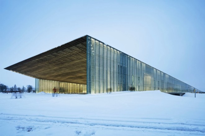 L’Eesti Rahva Muuseum / Estonian National Museum, aperto nel 2016, è stato progettato da un team di giovani architetti capitanato dalla franco-libanese Lina Ghotmeh e ha sede a Tartu, la seconda più importante città estone. L’eccezionale edificio museale prende forma dalla pista di un vecchio aeroporto militare sovietico la cui superficie fa “decollare” verso l’alto, proprio come se l’ampia striscia di cemento si sollevasse dal terreno grazie al lunghissimo tetto inclinato del museo. Come si può leggere in questo articolo su Archiportale.com, «Il progetto mira a creare una sorta di ‘casa aperta’ ai visitatori, un luogo di incontro e di interazione capace di riunire le persone accomunate dalla stessa storia che, per quanto sia stata anche dolorosa, deve essere celebrata e ricordata. In questo scenario la base militare abbandonata si configura come lo spazio ideale ad accogliere le intenzioni dei progettisti, in quanto luogo fortemente drammatico. La struttura rappresenta il più grande museo dei paesi baltici che racconta la storia culturale dell’Estonia a partire dall’età della pietra fino all’epoca contemporanea, con approfondimenti su tradizioni e rituali tipici di questa nazione.»