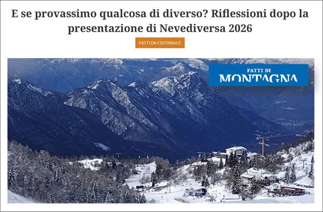 Con un articolato editoriale su “Fatti di Montagna”, Luca Serenthà offre uno dei più completi resoconti sulla presentazione del dossier “Nevediversa 2026”, avvenuta mercoledì 11 scorso a Milano. Scrive Serenthà: «Se si considerano i dati non per difendere il “business as usual”, se si ragiona con le comunità, se ci si confronta con chi fa impresa in montagna, se la politica non guardasse solo all’orizzonte elettorale, allora si raccoglieranno elementi che possono aiutare a tracciare strade nuove che portino a migliorare la vita nelle terre alte, per chi già c’è e per chi vorrebbe tornare o arrivare. Oppure possiamo rimanere ancorati al “si è sempre fatto così”, pensare ostinatamente che all’industria dello sci non c’è alternativa e vedere che succede.»