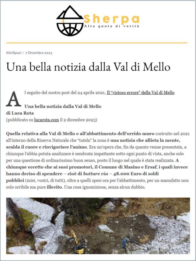 Ringrazio di cuore il portale web “Sherpa per l’attenzione riservata alle mie considerazioni intorno alle battaglie per la salvaguardia della Val di Mello. È un onore essere ospitati in un così prestigioso spazio di divulgazione culturale sui temi di montagna e da una figura tanto importante al riguardo come Alessandro Gogna che ne è l’ideatore e principale curatore.