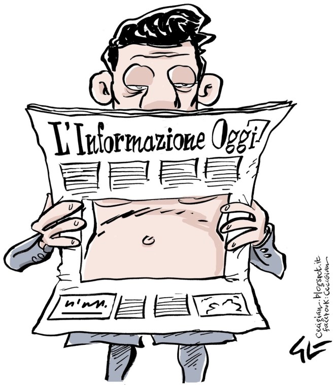 Standing ovation per Gian Lorenzo Ingrami, in arte Cecigian, vignettista di notevole arguzia e riconosciuta fama, che nella vignetta qui sopra riprodotta riesce a spiegare lo stato dell’arte dell’informazione contemporanea come parole e parole in gran quantità non potrebbero fare meglio.