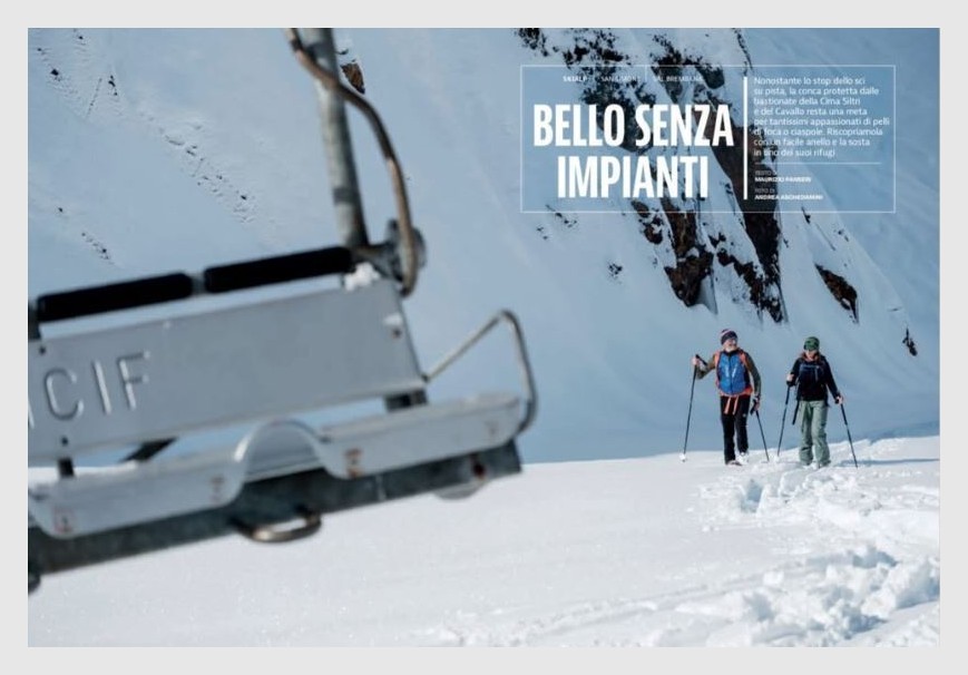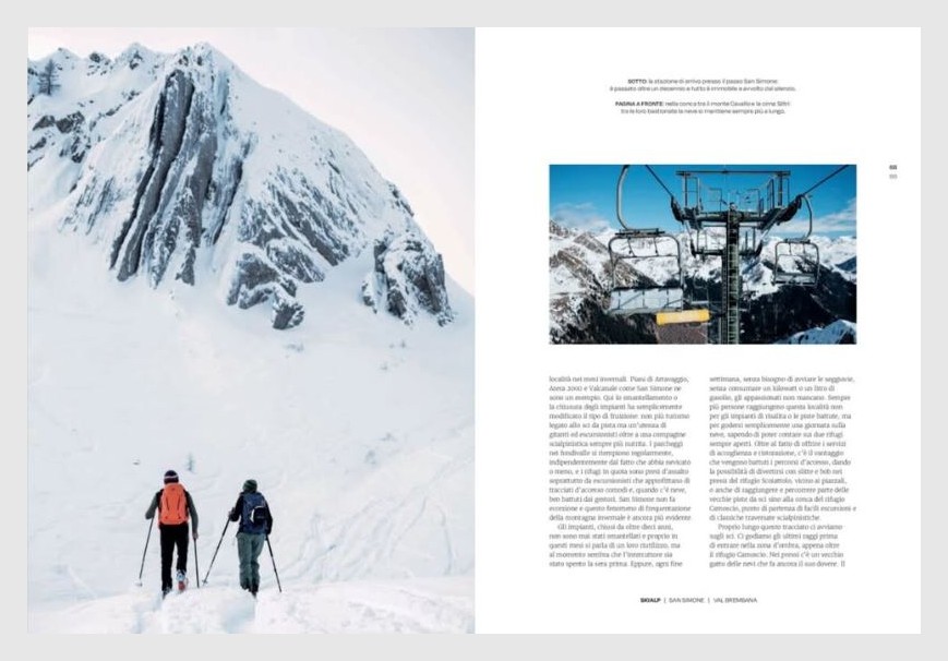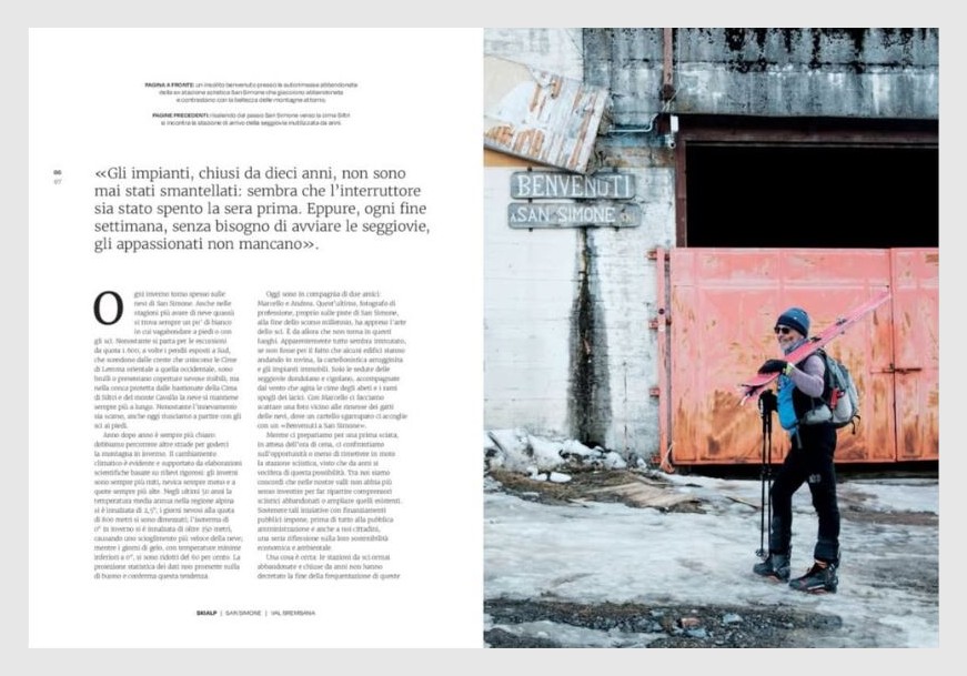 Dico che sia una “strategia” non solo perché, in questo nostro paese, a pensar male si fa peccato ma solitamente s’indovina. Lo dico perché di casi del genere ce ne sono ormai numerosi: dai Piani di Artavaggio, in Valsassina, il cui comprensorio sciistico venne chiuso nel 2000 per insostenibilità climatica e economica e negli anni è diventata una delle mete del turismo dolce più rinomate della Lombardia, dove qualche anno fa si propose di installare una nuova seggiovia, all’Alpe di Paglio, tra Valsassina e Valvarrone, con impianti chiusi nel 2005 e pista lasciata libera per i non sciatori, dove nei fine settimana trovare un posto per parcheggiare è quasi impossibile e pure qui si vorrebbe riaprire il comprensorio sciistico con nuovi impianti, al recente caso di Teglio, in Valtellina, che quest’anno ha dovuto tenere chiusi i propri impianti per fine vita tecnica così che la località è stata invasa da escursionisti d’ogni sorta (vedi il giornale lì sopra) ma di recente è stato annunciato il progetto di realizzare una nuova seggiovia, fino a San Simone, sulle Orobie bergamasche, dove gli impianti di risalita sono abbandonati da dieci anni e del cui successo non sciistico ne parla un bellissimo articolo di Maurizio Panseri, con le fotografie dell’amico Andrea Aschedamini, pubblicato sul numero di marzo della rivista “Orobie” (ne vedete alcune pagine qui nel post): anche qui il Comune di Valleve, nel cui territorio si trova San Simone, vorrebbe acquistare gli impianti dalla proprietà che li detiene per riaprirli, per di più con l’aggiunta di edificazioni e cementificazioni varie. Ma sono solo alcuni casi, e tutti lombardi, dei tanti che si potrebbero citare al riguardo.