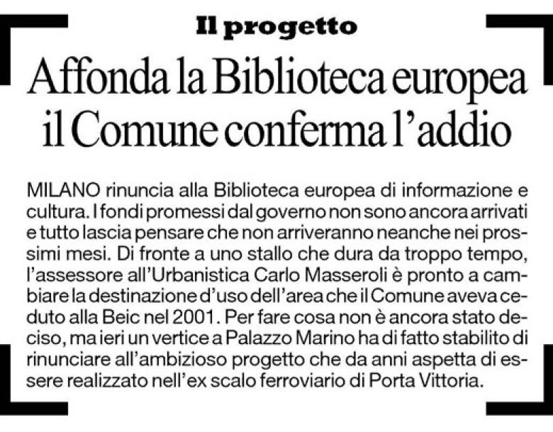 Milano, città che molti considerano la capitale culturale d’Italia, una nuova, grande e iconica biblioteca l’ha progettata: la BEIC, Biblioteca Europea di Informazione e Cultura, edificio architettonicamente potente e suggestivo che doveva sorgere nell’area di Porta Vittoria un tempo occupata da uno scalo ferroviario poi dismesso, e che doveva proprio rappresentare il fulcro di “un’arca per la cultura” – proprio con tale definizione veniva presentata la riqualificazione dell’area – con attorno altri luoghi di interesse culturale.