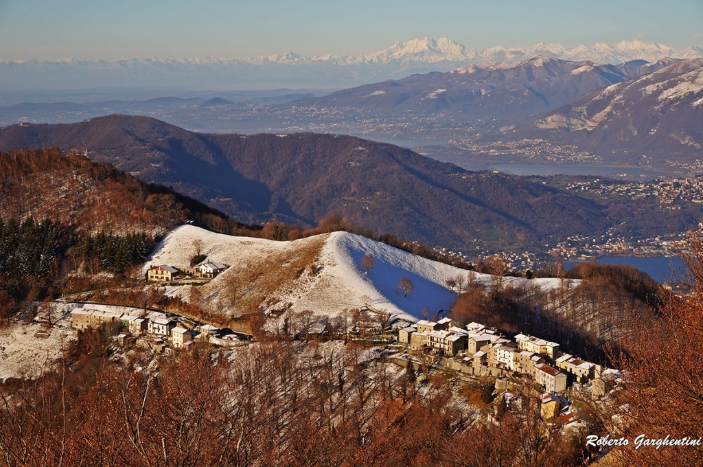 Un antico borgo di montagna sospeso tra due valli e due orizzonti nell’oscurità d’una sera di inizio gennaio, col cielo plumbeo da cui scende leggero un qualcosa che a momenti è neve e in altri è pioggia, e i boschi d’intorno a ovattarne l’atmosfera in un silenzio struggente e quasi mistico…