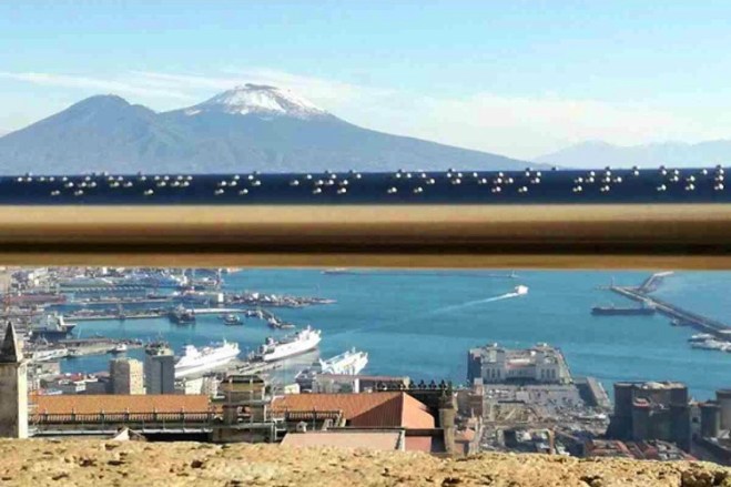 In realtà il corrimano è un’installazione artistica: si chiama Follow the shape, è stata ideata dall’artista napoletano Paolo Puddu e a ben vedere la semplicità, quando riesce a “dire” e fare così tanto, può ben essere definita una forma d’arte, assolutamente esemplare e emblematica. Lo è anche perché offre una soluzione creativa a un problema formalmente complesso come la fruibilità della bellezza paesaggistica, un elemento sostanzialmente immateriale, a chi suo malgrado non possa goderne – e corre rimarcare quanto sia significativo che tale realizzazione sia stata pensata da un artista, il che ribadisce l’importanza fondamentale della visione artistica nonché, indirettamente, la carenza (risaputa dacché cronica) riguardo tali sensibilità da parte delle amministrazioni politiche.