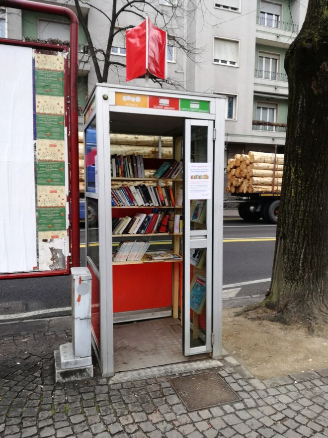 “Al posto del telefono all’interno della cabina si trova uno scaffale con libri e riviste che si possono sfogliare, leggere su una vicina panchina o portare semplicemente a casa. Chi vuole può portare da casa libri che ha già letto e lasciarli nella cabina, a disposizione di altri che la frequentano o passano di lì. La cabina-libri, sul modello di altre cabine-libri in varie parti del mondo, è sempre e liberamente accessibile a tutti ed è pensata per libri e riviste in diverse lingue, per bambini, giovani e adulti. La cabina-libri viene curata in collaborazione con l’associazione “Scioglilingua” che ha sede in Via Torino e organizza corsi di lingua per migranti.”