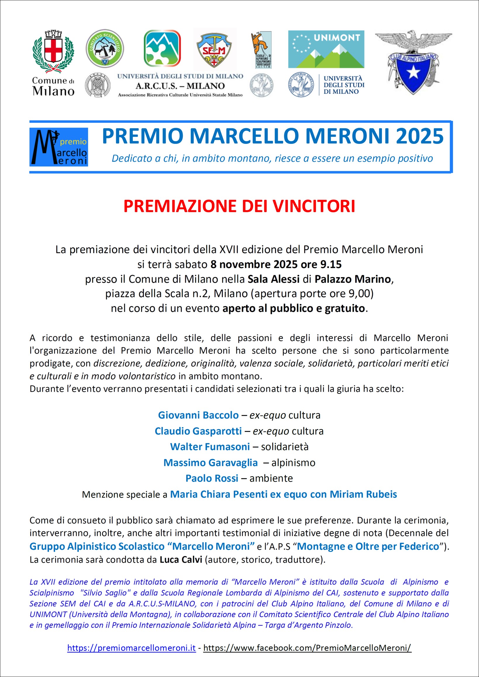[Tutti i premiati con i candidanti dell’edizione 2025 e gli organizzatori del Premio.]Il Premio “Marcello Meroni” non è un “semplice” premio. Non lo è perché intitolato a una persona veramente eccezionale come era Marcello Meroni, astrofisico, alpinista di livello eccelso, istruttore Nazionale di Alpinismo, persona di grandissima intelligenza e di altrettanta modestia. E non lo è perché dedicandosi a persone “eccezionalmente normali” che si sono contraddistinte per aver portato a termine iniziative di puro volontariato legate alla montagna e caratterizzate da originalità, valenza sociale, dedizione e meriti etici e culturali, ne riconosce le grandi qualità, che sono anche se non soprattuttoumane.