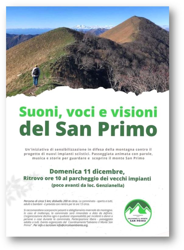 Per protestare contro i progetti di “sviluppo turistico” del Monte San Primo, il Coordinamento delle associazioni impegnate al riguardo ha organizzato una giornata in loco, domenica 11 dicembre (ne vedete qui accanto la locandina), durante la quale camminare nel meraviglioso paesaggio del San Primo e così sensibilizzare chiunque sull’importanza ineludibile di comprenderne a fondo la bellezza e valorizzarne realmente le pregevoli peculiarità e le conseguenti potenzialità di sviluppo d’un turismo consapevole, sostenibile e in grado attivare quelle economie locali, di natura circolare ma non solo, che possono assicurare all’intero territorio del monte un buon futuro e una protezione da qualsivoglia turistificazione banalizzante.