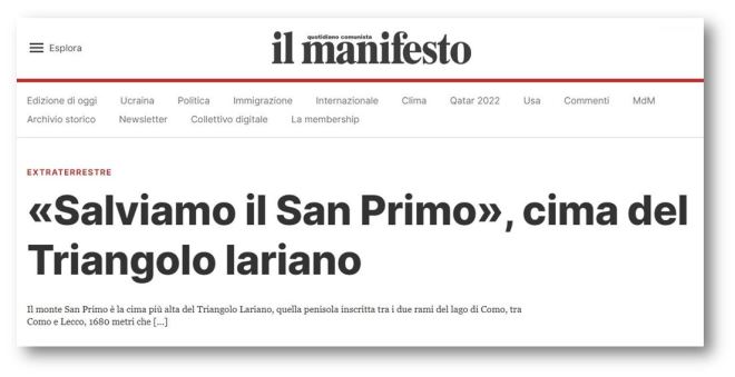 Giovedì 15 dicembre, sull’inserto “L’Extraterrestre” de “Il Manifesto”, è uscito un bell’articolo firmato da Teodoro Margarita sulle iniziative contro lo scriteriato progetto di “sviluppo turistico” del Monte San Primo messe in atto dal Coordinamento nato appositamente e composto da decine di associazioni del mondo della montagna e dell’ambientalismo lombardo. Nelle scorse settimane ne ho scritto spesso sul blog, qui trovate l’elenco degli articoli pubblicati. L’articolo de “L’Extraterrestre” lo potete leggere interamente cliccando sull’immagine del titolo oppure in pdf qui.