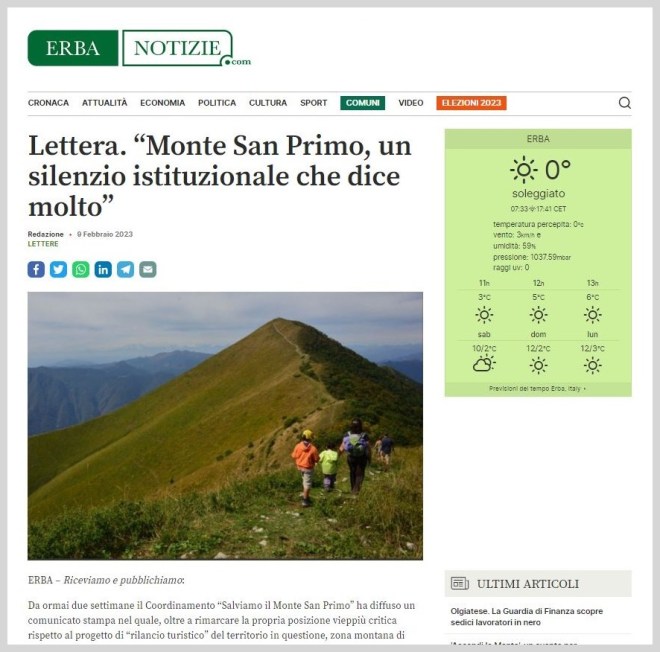 Ieri (9 febbraio 2023) il quotidiano on line “Erba Notizie” ha pubblicato le mie considerazioni in merito agli ultimi sviluppi della questione “Monte San Primo” e del relativo e contestato progetto di rilancio turistico – o, per meglio dire, in merito agli ultimi NON sviluppi, visto che le amministrazioni pubbliche che sostengono il progetto da mesi negano qualsiasi risposta alla società civile che chiede un confronto e un dibattito sul progetto. Come scrivo nell’articolo, «La posizione di rifiuto assunta dalla Comunità Montana e dal Comune di Bellagio impedisce un dibattito che, se razionale e ben condotto a fronte delle rispettive opinioni divergenti, non potrebbe che arricchire le proposte in questione alimentando pure la riflessione e la considerazione di altri temi importanti per il futuro del territorio del Monte San Primo». Invece, il reiterato silenzio al riguardo degli enti suddetti, oltre che negare un diritto proprio della democrazia e un dovere della rappresentanza politica, non può che far pensare male, inevitabilmente.