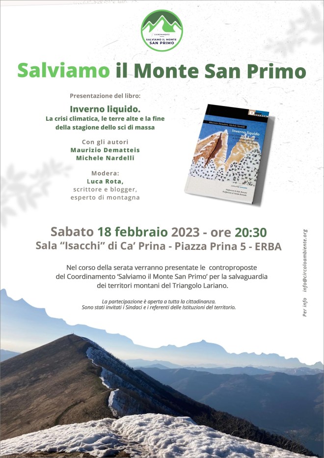 Contestualmente al “caso San Primo”, sabato 18 febbraio prossimo, dalle ore 20.30 presso la Sala “Isacchi” di Ca’ Prina a Erba (Como), avrò l’onore di condurre e moderare la serata dedicata alla presentazione di Inverno Liquido e delle iniziative messe in atto per la salvaguardia del Monte San Primo dal Coordinamento costituitosi al riguardo il quale riunisce trenta associazioni operanti nel territorio in questione e su scala regionale.