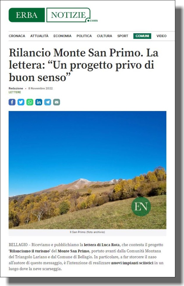 Quindi è una bella e nobile iniziativa quella che ha determinato la costituzione del Coordinamento “Salviamo il Monte San Primo”, unendo sotto tale egida ben 19 associazioni di vario genere, non solo specificatamente ambientaliste, che agiscono sia nell’ambito locale che in quello regionale e nazionale, oltre che un gran numero di persone che stanno pubblicamente manifestando la loro netta opposizione al progetto, magari anche inviando messaggi al riguardo agli enti locali coinvolti (si veda qui sotto). Il primo atto del Coordinamento è stata la diffusione di un “appello pubblico” nel quale sono riportati i principi cardine dell’azione dei soggetti che vi partecipano, le richieste al riguardo agli enti pubblici locali e alcune proposte alternative di immediata realizzazione atte a riequilibrare il progetto e soprattutto il suo impatto sul luogo.