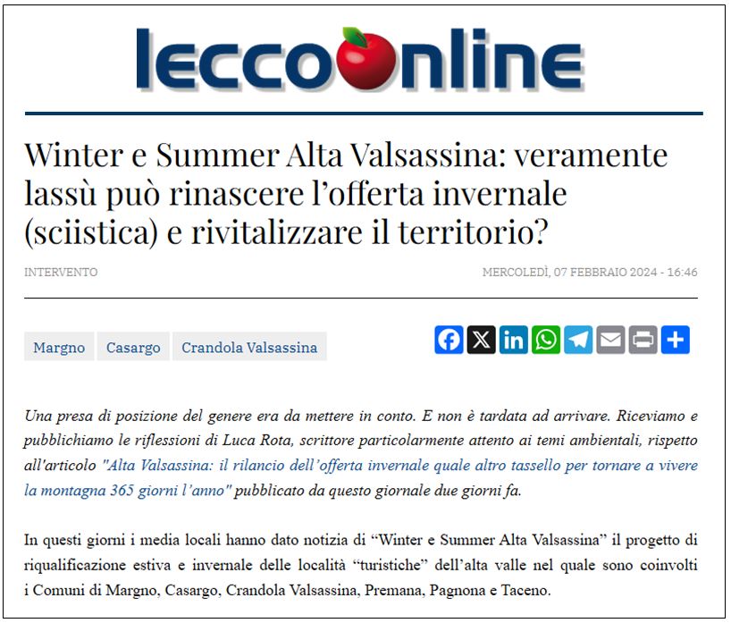 Magari il progetto “Winter e Summer Alta Valsassina” rappresenterà una grande e benefica rivoluzione per residenti e turisti rivitalizzando la zona e la sua economia. Magari sarà l’ennesimo spreco di denaro pubblico a danno del territorio e a fronte di ben altri bisogni necessari agli abitanti dell’Alta Valsassina per vivere al meglio la propria quotidianità.