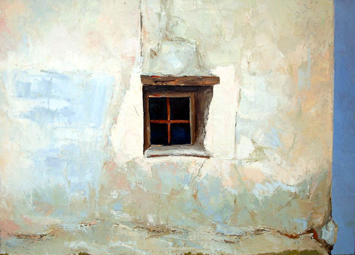 Ad esempio, per dirvi di quelle mie nuove, inopinate “scoperte” nei quadri di Vaninetti: nell’opera qui sopra, Finestra e muro bianco (1987), nell’ampia campitura cromatica principale, solo variata da leggere sfumature e, ovviamente, da quel “buco” della finestra, ma pure nella striscia di cielo d’un azzurro pressoché uniforme che si contrappone col muro della casa ma senza contrasto, semmai in un’alternanza di colori assai vivi e al contempo garbati, niente affatto dissonanti, appunto, ecco, ci rivedo e non poco la spiritualità cromatica di Mark Rothko, meno cosmica, più rurale eppure similmente profonda e meditativa. Inoltre, quel buco nero della piccola finestra che squarcia il muro, non ricorda in qualche modo (nel principio) il nero che si effonde dai tagli dei Concetti Spaziali di Lucio Fontana? Anche in tal caso senza accezione cosmica e con una significazione più terrena, pragmatica, che rimanda ad un’umana quotidianità ben più semplice ma non per questo meno “misteriosa”, soprattutto proprio nella relazione ancestrale col paesaggio (montano in primis, ma non solo) del quale le forme ritratte da Vaninetti sono un elemento sovente peculiare.