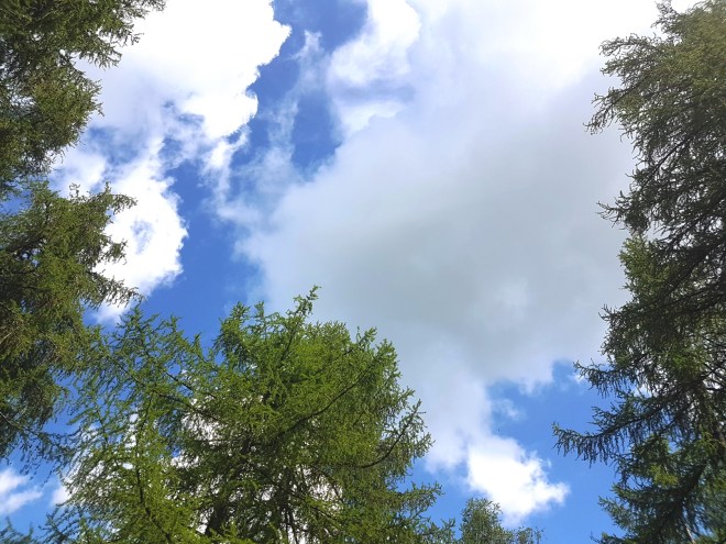 Chissà se quelli che salgono in montagna alla ricerca di panchine giganti, ponti tibetani, passerelle panoramiche e altre amenità da parco giochi alpestre sanno rendersi conto della grande bellezza che sicuramente li circonda, nei luoghi che ospitano quegli intrattenimenti, nelle grandi vedute come nei piccoli dettagli: ad esempio del meraviglioso “disegno” del cielo generato dalle cime degli alberi di un bosco (un ricamo arboreo che spesso mi fermo di colpo a osservare, quasi incantato da una così semplice, minima eppure incantevole visione… magari sembrando un idiota, per chi mi vedesse in quei momenti e sotto certi aspetti a ragione, per come mi sa imbambolare). Io mi auguro di sì, che se ne rendano conto della bellezza che hanno intorno anche se non tutti, visti gli atteggiamenti e i comportamenti di alcuni, ma tanti sì, lo spero.