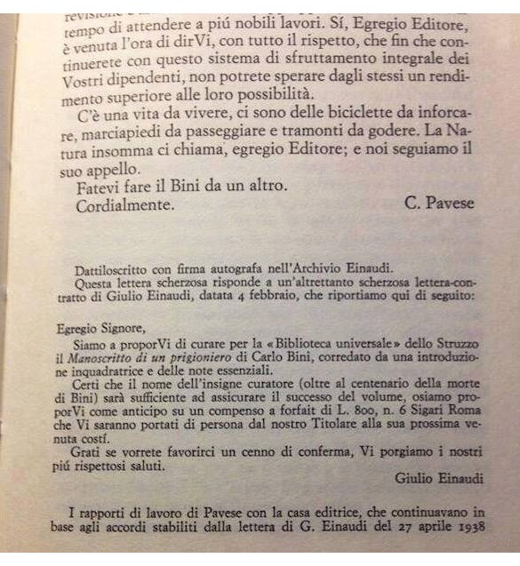 P.S. del 08/04: come mi ha giustamente fatto notare qualcuno – ad esempio Dario Bonacina oppure Veronica Adriani, che ringrazio – la sopra riprodotta lettera di Cesare Pavese non aveva invece alcuna matrice astiosa, ma era parte di uno scambio scherzoso tra lo stesso Pavese e il suo editore, Giulio Einaudi. Ecco di seguito la lettera antecedente che “provocò” la risposta dello scrittore: