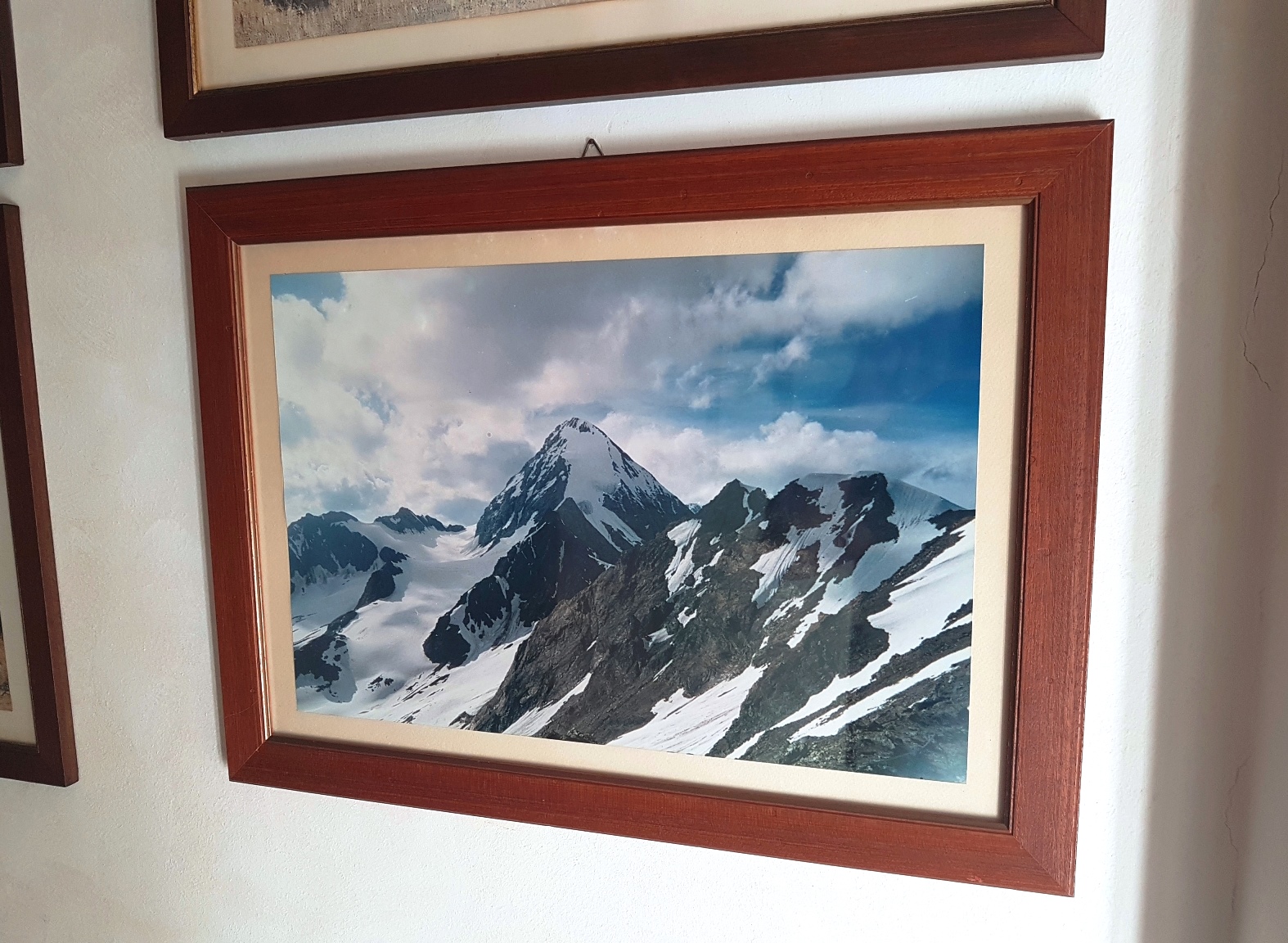 Ormai decenni fa, quando avevo poco più di vent’anni (dunque metà anni Novanta, in pratica), con alcuni amici salii per la prima volta il Cevedale, trovandomi così al cospetto di una montagna la cui bellezza iconica mi conquistò subito, per come era ed è possibile osservarla dalla via normale al Cevedale dal rifugio Casati: il Gran Zebrù/Königsspitze, una piramide pressoché perfetta puntata verso il cielo e scintillante di ghiaccio. Scattai una fotografia (il digitale era ancora roba rara, ai tempi) e ne ricavai un ingrandimento che incorniciai e appesi a casa – dove ora vivono i miei genitori e dove fa ancora bella mostra di sé, vicino all’ingresso: lo vedete lì sopra (e tenete conto che erano i primi di agosto, se volete fare qualche raffronto con il presente). Al netto del celeberrimo Cervino, credo sia una delle montagne più belle e “potenti” delle Alpi, il Gran Zebrù, e capace di narrare storie meravigliose su di sé, come raccontai in questo articolo.