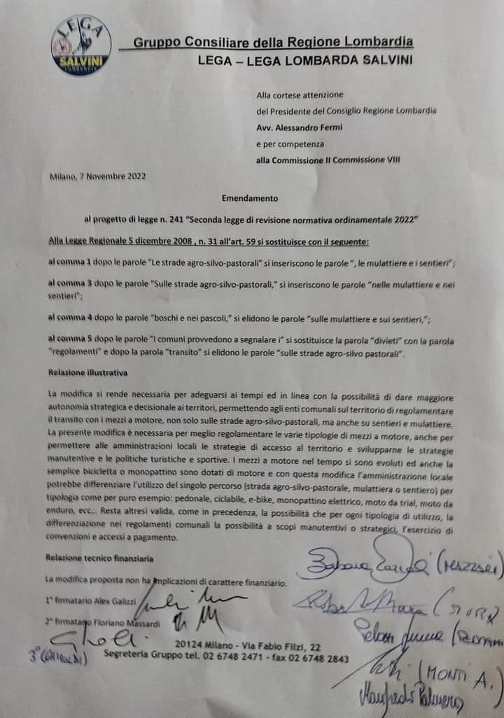 Intanto, in Lombardia, ci sono amministratori pubblici che in base a motivazioni che mi viene da definire semplicemente deliranti vorrebbe liberalizzare il transito di tutti i mezzi motorizzati non solo sulle strade agro-silvo-pastorali ma anche su mulattiere e sentieri di montagna, demandando le decisioni al riguardo ai comuni ma, appunto, sostanzialmente dando loro carta bianca.