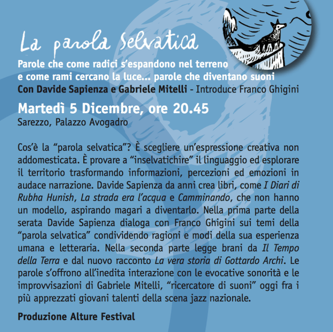 Ho impiegato qualche giorno per mettere nero su bianco quanto state per leggere, e non certo perché mi mancassero argomenti al riguardo. In realtà La Parola Selvatica. Il Suono, la “performance” (uso questo termine sapendo tuttavia che possa risultare improprio, sotto certi aspetti) di parole e suoni congegnata da Davide Sapienza e Gabriele Mitelli su testi tratti da La vera storia di Gottardo Archi – l’ultimo libro al momento in cui scrivo di Sapienza – e della quale ho avuto la fortuna di assistere qualche giorno fa a una “prova generale” nella sua forma ormai definitiva, che a breve comincerà a girare per luoghi e pubblici vari, è talmente potente e intensa che abbisogna necessariamente, io credo, di un certo periodo di elaborazione, se non di metabolizzazione (intellettuale e spirituale).