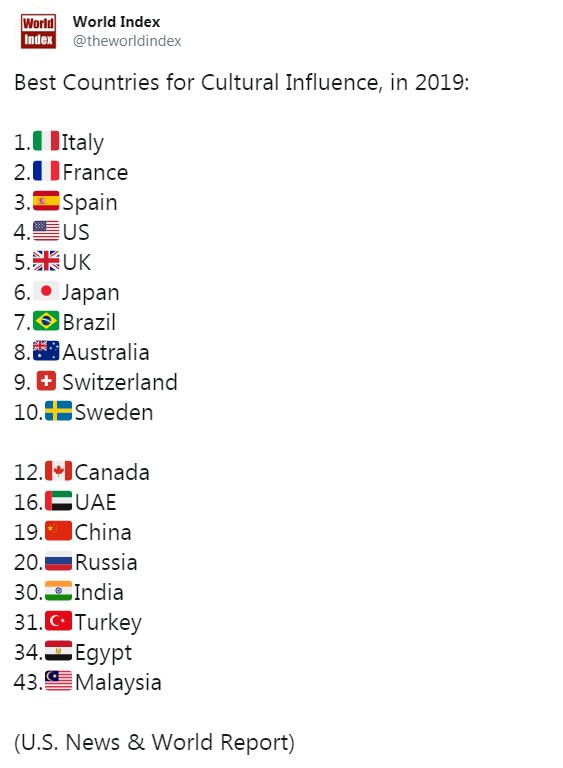 Sulla propria pagina Twitter, World Index ha pubblicato di recente la graduatoria dei paesi del pianeta con maggior influenza culturale: