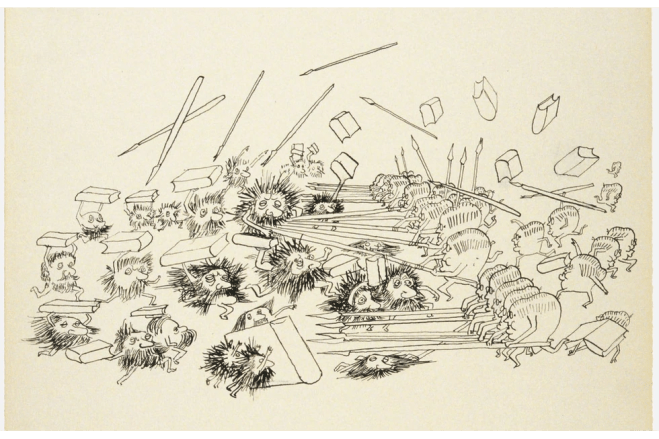 [Friedrich Dürrenmatt, Battaglia di Sempach tra artisti e critici*, 1963, inchiostro su carta, 35,4 × 26,8 cm, Collezione Centro Dürrenmatt Neuchâtel.]