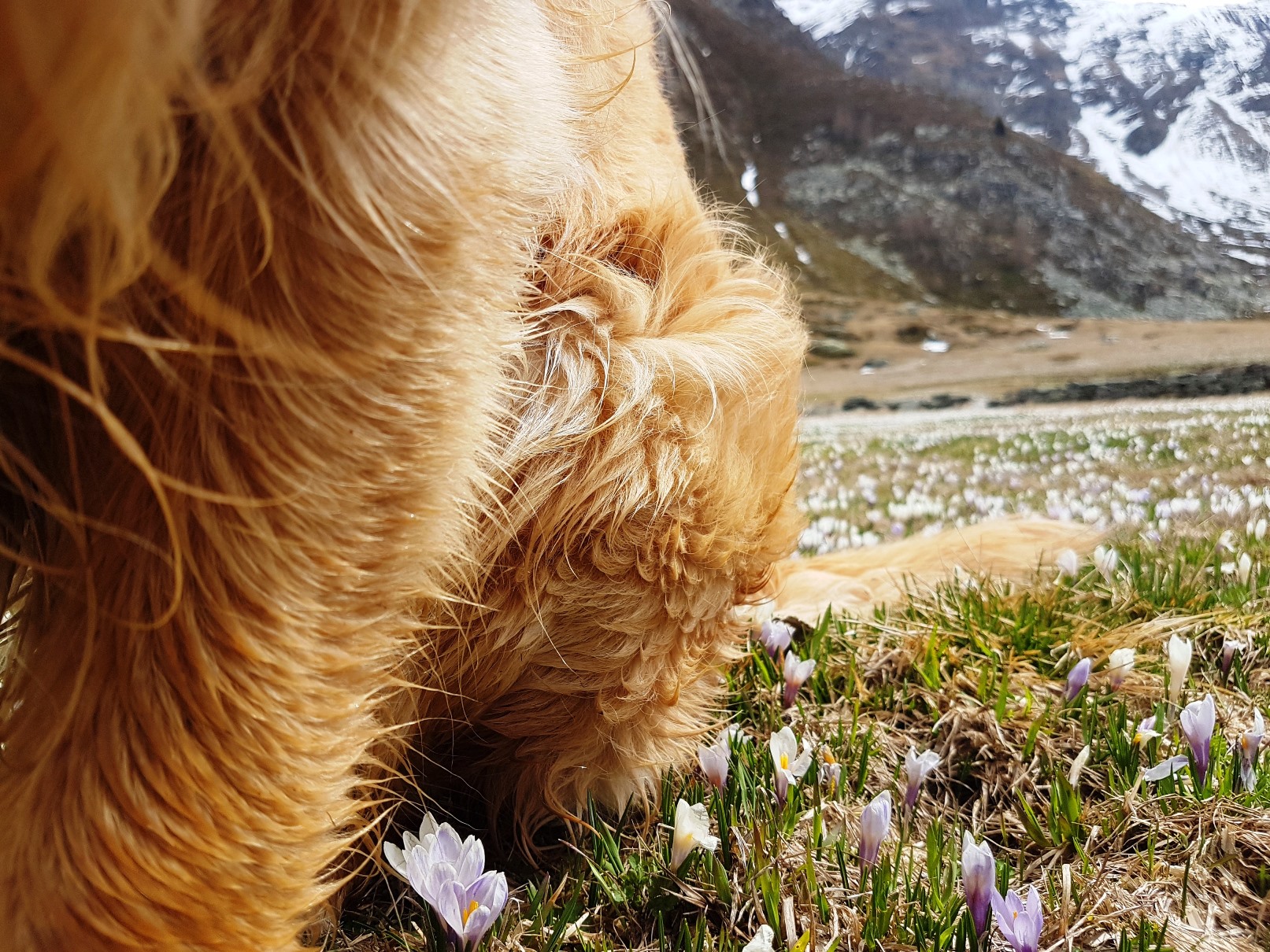 Mi sarebbe piaciuto molto fotografare la meravigliosa distesa di crocus che avevo di fronte, i quali punteggiavano vivacemente il prato in alta montagna appena liberatosi dall’ultima neve della stagione con i loro colori resi così brillanti dalla rugiada nel Sole mattutino… se solo il mio segretario personale a forma di cane fosse stato d’accordo!