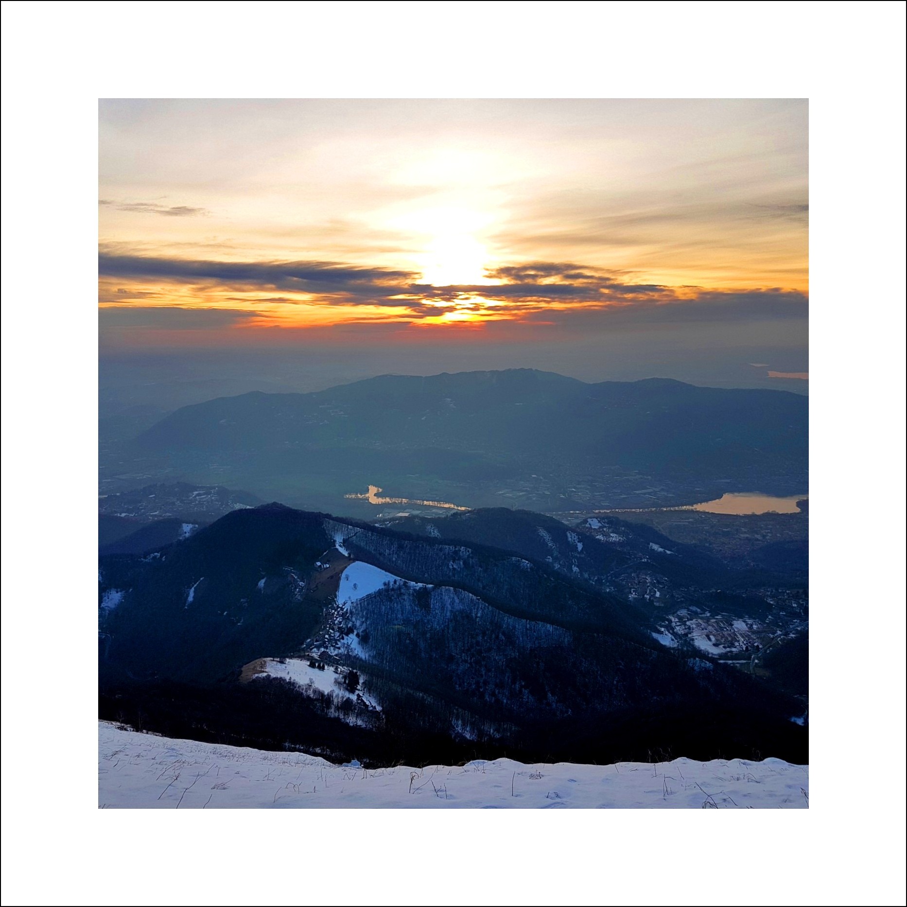 Restiamo qualche secondo in silenzio, entrambi osservando la vastità del paesaggio verso occidente, verso l’inseguirsi di colli, di monti e di valli – nei solchi vallivi più ampi è facile intuire la presenza dei grandi laghi alpini – e in fondo, come un miraggio sublime sopra le foschie salenti dalla pianura, le scintillanti vette delle Alpi, limite ultimo di una illimitatezza emozionante che assume colori inopinati, sotto quel cielo un po’ bigio, un po’ sereno, tipicamente autunnale.“