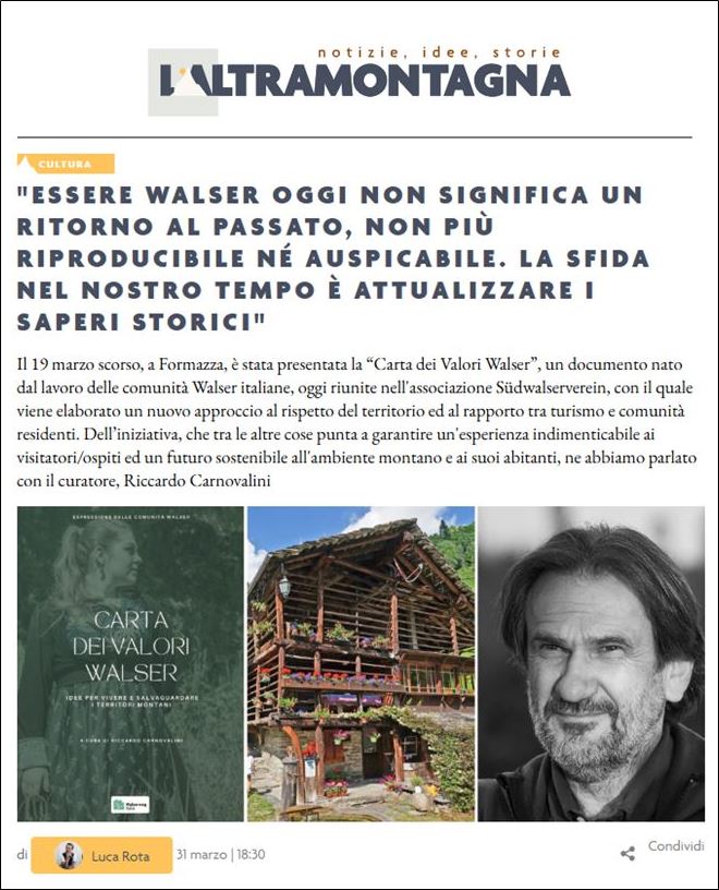 Come ho scritto in questo articolo del blog, il 19 marzo scorso a Formazza è stata presentata la “Carta dei Valori Walser”, un documento nato dal lavoro delle comunità Walser italiane, oggi riunite nell’associazione Südwalserverein, con il quale viene elaborato un nuovo approccio al rispetto del territorio alpino (afferente alla zona di residenza delle comunità walser ma non solo) ed al rapporto tra turismo e comunità residenti.
