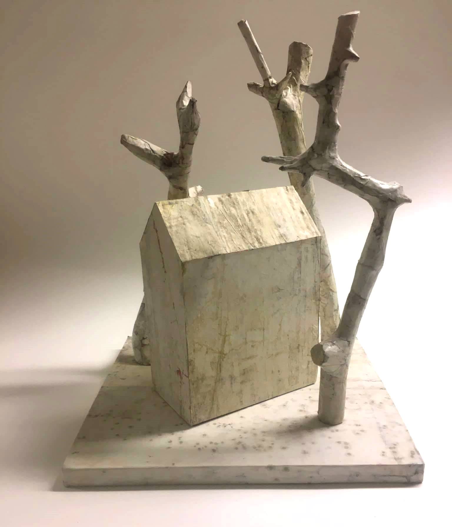 La casa nel bosco. Inverno fa parte della serie “Heimat (nome azzeccatissimo, anche per ciò che ho appena scritto) rispetto ai cui altri lavori Guido mi rivela che «È una sorta di “passo di lato”, in questo periodo dove sento particolarmente il bisogno di allontanarmi dal mercato del mondo per stare ancor più a contatto con la natura. Sono sempre più spesso nel bosco: medito, faccio legna e mi imbatto in animali e in loro ossa. Mi sento un po’ profeta inascoltato e come diceva Giovannino Guareschi in Mondo piccolo, «quando il fiume travolge gli argini e i campi, bisogna salvare il seme». Ovvero la vita nella sua essenza più profonda e importante: un seme che ci scordiamo spesso di portare appresso fino a che, appunto, entriamo in un bosco, ritroviamo la relazione con quella dimensione naturale, ancestrale e atemporale quale autentica Heimat originale, lasciando al di fuori del perimetro silvestre – se ne siamo capaci – buona parte della nostra più pesante e travolgente quotidianità. A questo punto allora probabilmente sì, sentiremo di nuovo tra le mani, nel cuore e nell’animo la presenza benefica e vitale di quel seme e capiremo che noi siamo il terreno nel quale può germogliare, tanto più se protetti dal bosco e dalla primordiale salvaguardia che sa offrirci.