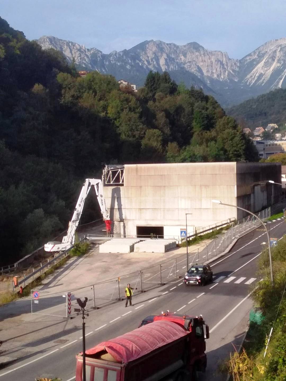 Come annunciato nei giorni scorsi sono iniziate questa mattina le operazioni di abbattimento del cubo di proprietà della società San Pellegrino. Il cantiere avrà una durata di circa due mesi, durante i quali verranno dapprima rimossi i pannelli in calcestruzzo che ricoprono la struttura per poi passare allo scheletro interno. Sul posto i materiali vengono separati per avviarli anche a percorsi di possibile recupero. Per Recoaro Terme è un vero e proprio evento che permetterà di restituire una nuova vista sulla corona delle Piccole Dolomiti fin dall’ingresso al paese.