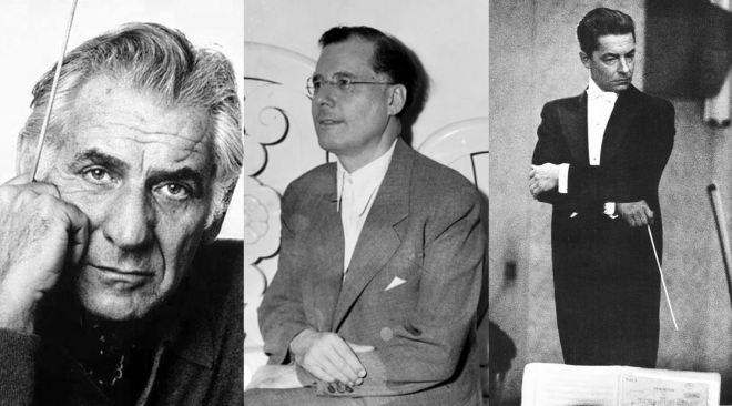 [Bernstein, Böhm e Karajan. Fonte: Wikimedia Commons.]