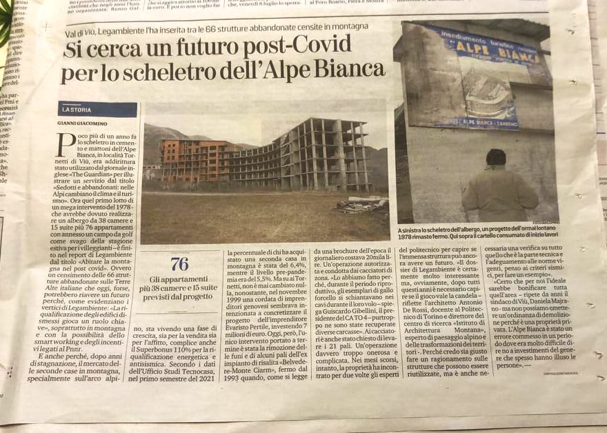 Seppure con una certa fatica, posso convenire con l’affermazione della Sindaca di Viù. Frase riportata dal giornalista che ha redatto l’articolo apparso di recente su La Stampa (“Si cerca un futuro post-Covid per lo scheletro dell’Alpe Bianca)