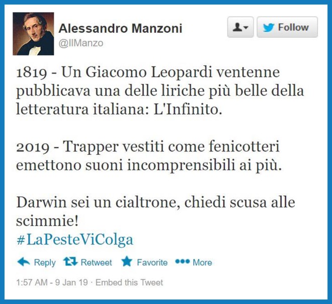 Poi, certo, siamo in un paese nel quale, se si chiedesse a certuni “l’infinito” di Leopardi, temo che quelli risponderebbero leopardare. Il che, fosse pure stato il buon Giacomo il più sfigato del suo tempo, lo rende senza alcun dubbio infinitamente troppo grande e inarrivabile per tanti omuncoli contemporanei, naufragati amaramente nel loro mare di analfabeta ottusità.