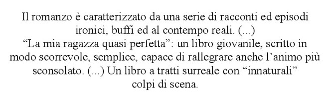 In ogni caso, La mia ragazza quasi perfetta si conferma una lettura molto gradita dal pubblico femminile, nonostante il protagonista del romanzo sia un uomo con sguardo sul mondo da uomo, e ciò certamente non può che farmi molto piacere.