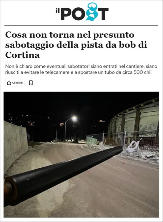Lo stesso accadrà a Cortina, statene certi, così come in molti altri territori sedi di opere olimpiche (in Valtellina, ad esempio). I responsabili di ciò che sta accadendo, quando la pista ora in costruzione verrà abbandonata, saranno ormai altrove a effondere la propria stessa protervia sotto forma di slogan e propagande, magari seduti su scranni politici di livello ancora più elevato (fare disastri in Italia paga sempre, soprattutto in politica), comunque intoccabili rispetto alle responsabilità pur evidenti di ciò che accadrà. Non solo: se ne vanteranno pure, di tali opere fallimentari, perché oggi come non mai sostenere il falso è la strategia politica più in voga, in tali circostanze ovvero nei contesti in cui una parte dell’opinione pubblica abbia smarrito o dimenticato le facoltà di pensiero e di buon senso. Anche in tal caso la pista di bob di Cortina è esemplare, come dimostra la recente questione dei presunti “sabotaggi”, palesemente campata per aria e funzionale a nascondere incompetenze e difficoltà varie e assortite.