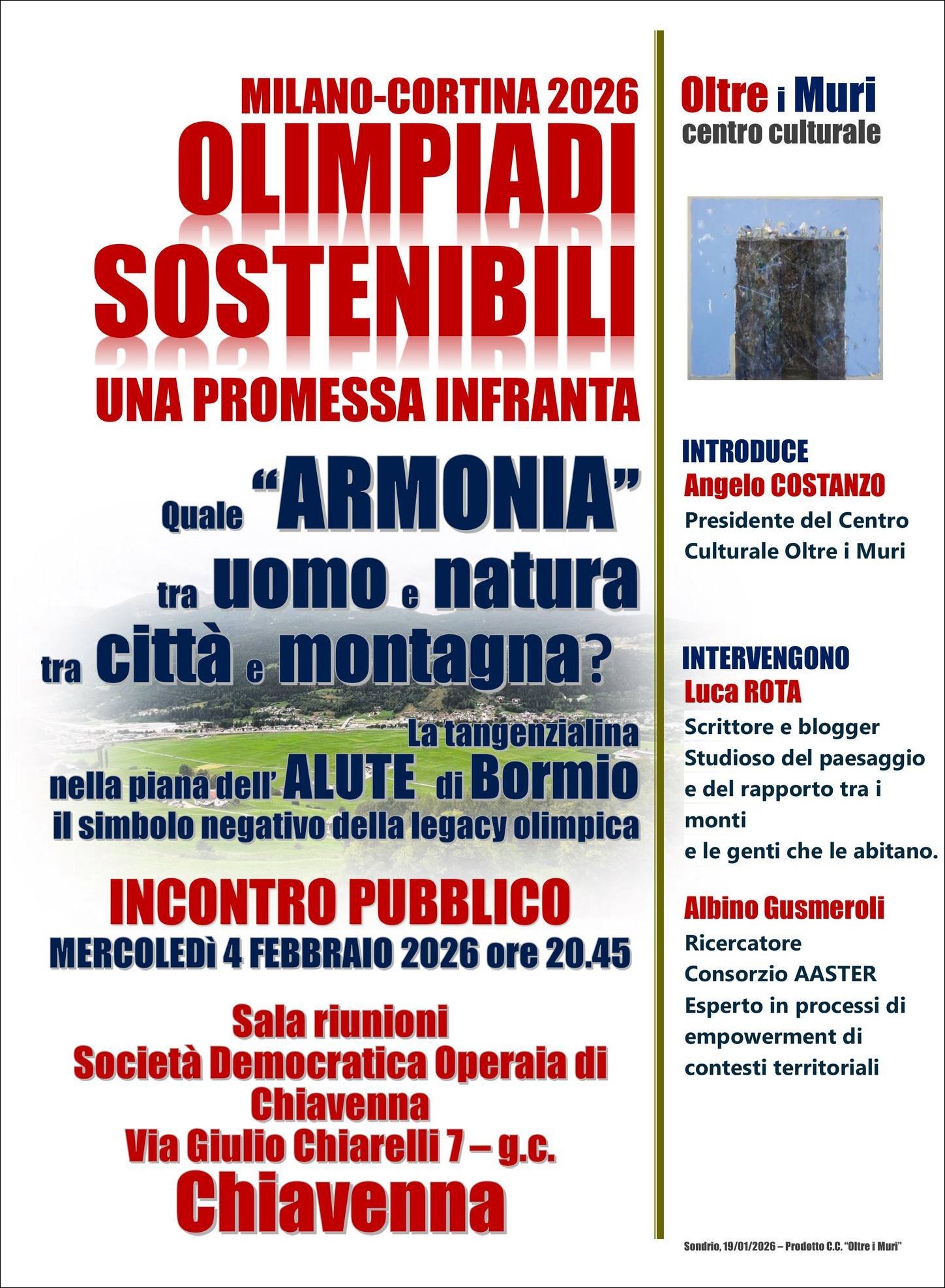 Di questi importanti e affascinanti temi, di interesse generale che se necessariamente contestualizzati (e contestualizzabili) a ogni singolo territorio montano, ne parlerò mercoledì 04/02 a Chiavenna, presso la sede della Società Democratica Operaia, in un evento dal titolo “Olimpiadi sostenibili: una promessa infranta. Quale “armonia” tra uomo e Natura, tra città e montagna?” organizzato e curato dal Centro Culturale “Oltre i Muri” di Sondrio, insieme alle prestigiose figure di Angelo Costanzo, Presidente di “Oltre i Muri” e profondo conoscitore della realtà contemporanea della provincia di Sondrio, e Albino Gusmeroli, ricercatore del Consorzio AASTER ed esperto di processi di empowerment dei contesti territoriali.