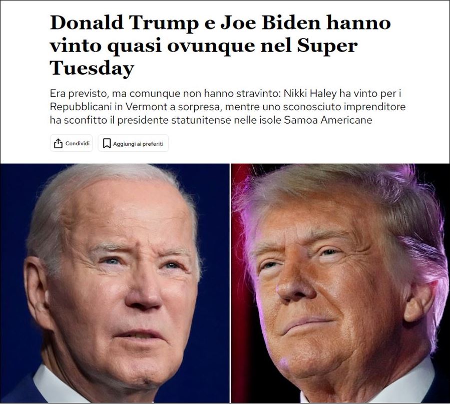 Fatto sta che io da otto anni e più resto letteralmente basito nel constatare come quello che a tutti gli effetti, nel bene e nel male, è ancora lo stato più influente e importante del mondo possa accettare di eleggere alla propria massima carica istituzionale un teppista delinquente e ignorante oppure un vecchio ottenebrato e irresoluto. E che i due schieramenti politici a cui i soggetti citati fanno riferimento, a loro modo i maggiori e più importanti partiti di “destra” e di “sinistra” del mondo occidentale, non sappiano far altro che adeguarsi a quelle due figure talmente sconcertanti e fuori dal tempo. Siano pure rappresentative dei rispettivi elettorati, determinano un’immagine e una considerazione del loro paese – la massima superpotenza mondiale, ribadisco – drammaticamente miserrima e problematica. Ecco.