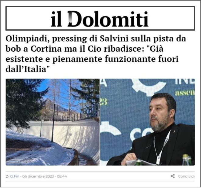 Io credo che, se veramente la pista di bob olimpica di Cortina verrà realizzata – come purtroppo temo avverrà, vista la bieca e cieca prepotenza di chi la sta imponendo fregandosene di ogni indicazione e considerazione altrui nonché della lezione della pista di Cesana Torinese, costata 110 milioni di Euro e ora in rovina – rappresenterà una delle più grandi vergogne della storia italiana contemporanea. Una colpa per la quale la responsabilità dovrà necessariamente ricadere su chi l’avrà imposta al territorio e alla sua comunità, in modo inalienabile. Punto.