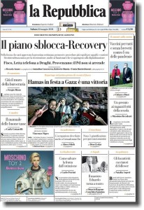 Finita l’ennesima messinscena bellica – il termine è duro e forse irrispettoso per i poveri morti, ma io la penso così, come ribadisco, – tra Israele e Hamas, il cui solito copione è stato anche questa volta rispettato senza alcuna modifica (proteste, prime scaramucce, scambio di accuse, razzi da Gaza su Israele, bombardamenti di Israele su Gaza, diplomazia che lentamente si muove, cessate il fuoco, tregua, pace armata e amen), noto sui media internazionali una foto tra le tante (in Italia è sulla prima pagina de “la Repubblica” del 22 maggio, come vedete – cliccateci sopra per ingrandire l’immagine) che, a mio parere, rappresenta bene l’unica e concreta certezza della realtà storica del Medio Oriente israelo-palestinese. Quei bambini che con il padre (suppongo) fanno il segno della vittoria tra le macerie dei bombardamenti, palestinesi o israeliani che siano, non stanno facendo altro – loro malgrado – che introiettare nella propria interiorità la guerra, ovvero la possibilità e la “normalità” di una condizione di violenza e di morte che, facilmente, riporteranno fuori da adulti perpetuandola come qualcosa di naturale e, dal loro punto di vista, di “giusto”. Sono bambini ai quali lo stato di scontro generale e costante tra i due stati insegna la guerra, praticamente: vengono “educati” ai suoni, ai rumori, alle visioni di morte e distruzione in un modo che, ripeto, inevitabilmente diverrà per loro “cultura” – distorta, barbarica, devastante ma tale, antropologicamente parlando. Nessuno lì, e nessuno altrove, insegna loro la pace, la possibilità del dialogo, del confronto moderato e pacifico: ciò significa che anche nei prossimi anni, cioè nel futuro di quei bambini che diventeranno adulti e di quella parte del mondo che essi abiteranno, la presenza della guerra sarà garantita.