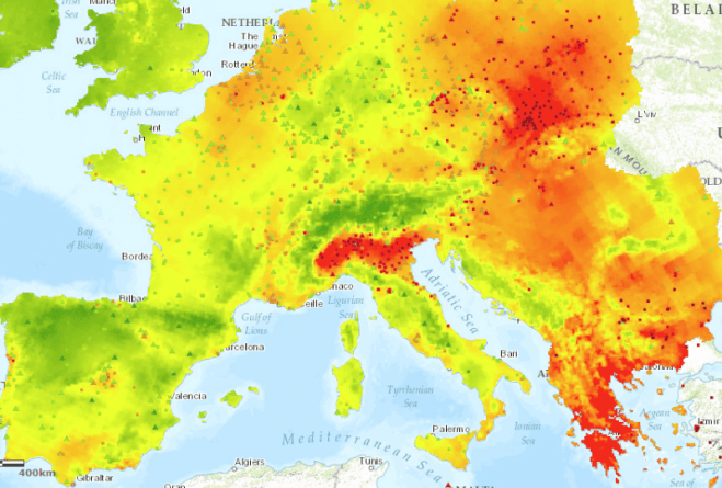 Nella cartina sopra pubblicata, elaborata dall’Agenzia Europea dell’Ambiente, è rappresentata la concentrazione di PM10 – la famigerata Materia Particolata, esatto – negli stati europei.
