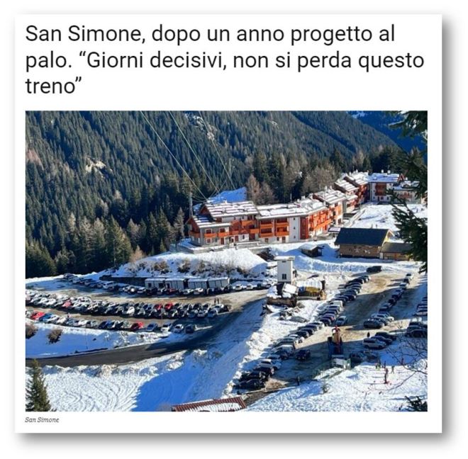 A San Simone si vorrebbero ripristinare e rinnovare alcuni degli impianti sciistici, con solite opere annesse (si veda il dettaglio nell’articolo cliccando sull’immagine), in un’area sciistica che come quota massima giunge a 2057 m, dunque appena oltre il limite climatico dei 2000 m ormai unanimemente considerato quello al di sotto del quale lo svolgimento di una stagione sciistica non è più garantita – nonostante la zona un tempo fosse particolarmente nevosa rispetto ad altre, ma è altrettanto inutile denotare che i cambiamenti climatici in corso stanno incidendo radicalmente anche sulle storicità del clima locale. Per fare ciò si vorrebbero spendere 2 milioni di Euro di soldi pubblici a fondo perduto (più altri 2 da privati ma al momento non pervenuti, si veda l’articolo come sopra); di contro nel progetto proposto non vi è traccia di altri interventi di turismo sostenibile e non sciistico.