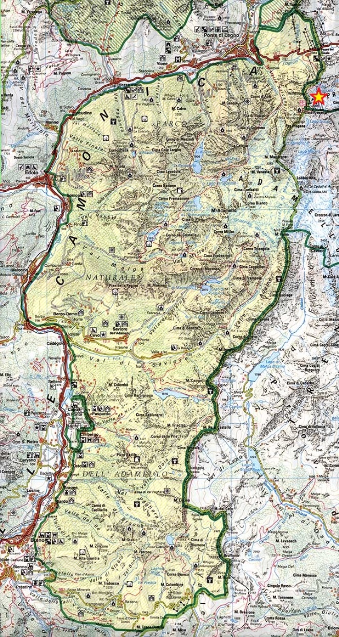 [La stella rossa e gialla in alto a destra indica la posizione del Rifugio Capanna Presena, adiacente ai confini dell’area protetta del Parco Regionale dell’Adamello.]L’eventuale obiezione che si tratta di eventi temporanei i quali una volta conclusi non lasciano tracce, se può anche essere accettata dal punto di vista ambientale (me lo auguro!), per il resto non sta proprio in piedi: è risaputo che in tali circostanze non conta il “contenitore” ma ciò che contiene, che vi viene messo dentro e al quale, dunque, viene affidata la costruzione dell’immagine del luogo e il senso della sua fruizione. Se il contenuto fosse quanto dichiarato in quei passaggi nel sito web della Capanna Presena, non avrebbe senso l’organizzare eventi del genere; se lo si fa è perché si cerca di deviare dal contesto, cioè dal contenitore, per cambiargli la funzione, la destinazione d’uso. Ma così facendo si finisce per svilire e degradare il contesto, cioè il luogo montano nel quale si opera, avviandone una inesorabile decadenza turistica e culturale (dacché invece i veri appassionati di montagna già se ne staranno ben lontani da situazioni del genere, continuando a percepirne e riconoscerne l’anima autentica).