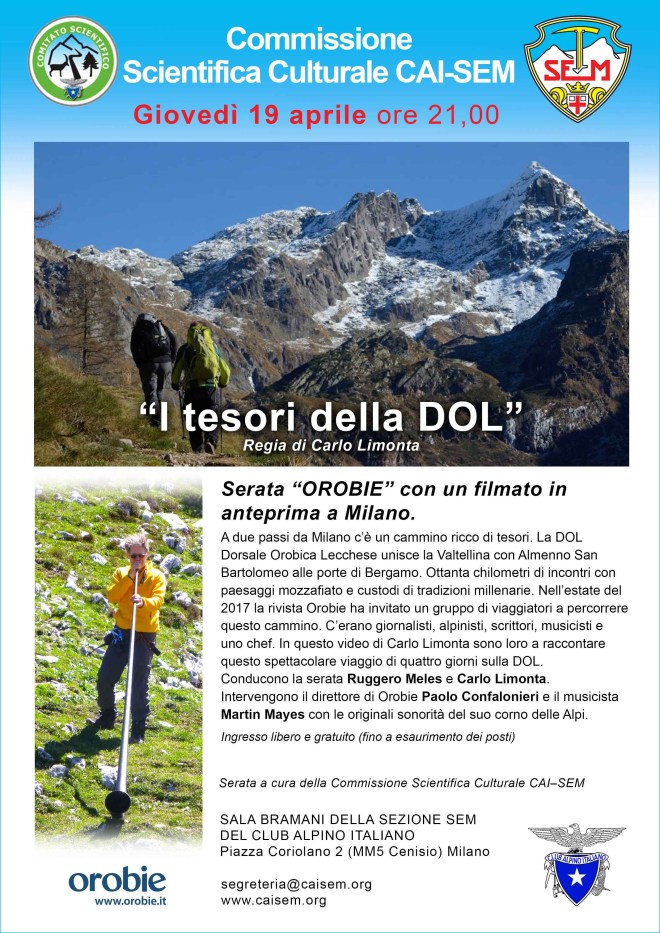 Lo scorso luglio 2017 la 5a edizione de In Viaggio sulle Orobie, il trekking culturale (nel senso più ampio dell’aggettivo) organizzato dalla rivista OROBIE, ha percorso la DOL – Dorsale Orobica Lecchese, uno degli itinerari montani più belli delle Alpi Centrali. È stata un’edizione speciale, avente il preciso scopo di rilanciarne e valorizzarne la bellezza paesaggistica e le infinite potenzialità turistiche del percorso, peraltro ricco di autentici “tesori” naturali, storici, architettonici, etnografici. Al punto che dal Viaggio, e dalle tante suggestioni scaturite in quei giorni di cammino e nei mesi successivi, è nato un docu-film che rappresenta la più affascinante e illuminante testimonianza del trekking e, in primis, della bellezza e del valore della dorsale:I Tesori della DOL, con la prestigiosa “firma” del regista Carlo Limonta, che sarà presentato in anteprima assoluta giovedì 19 aprile presso la sezione SEM – Società Escursionisti Milanesi – del CAI, a Milano. Una “prima” imperdibile per una pellicola assolutamente affascinante, che parlando della DOL, delle genti, dei paesaggi, delle culture – e ovviamente parlando e facendo parlare i viaggiatori che hanno composto il gruppo in cammino – parla di una storia di montagna meravigliosa e assai emblematica, e di come un territorio apparentemente “secondario” rispetto ad altre aree turisticamente più sviluppate (e per questo a volte fin troppo degradate) possa invece non solo essere rilanciato ma divenire addirittura un modello di sviluppo e di evoluzione turistico-culturale tra i migliori possibili. E di sicuro I Tesori della DOL e la grande perizia artistica di Carlo Limonta, film maker pluripremiato e unanimemente apprezzato, sono il più spettacolare biglietto da visita per la DOL e le sue montagne.