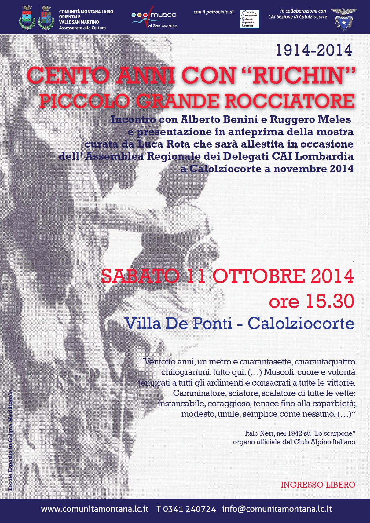 Ultimo ma non ultimo, il libro sarà presentato al pubblico per la prima volta sabato 15 Novembre prossimo, alle ore 18.00, presso la sede del CAI di Calolziocorte. Nell’occasione, sarà nuovamente visibile ai presenti la mostra fotografica Cento anni con Ruchin, piccolo grande rocciatore, che ho curato e della quale vi ho già riferito, nel blog. QUI trovate le info utili su come raggiungerla, oppure potete dare un occhio QUI.